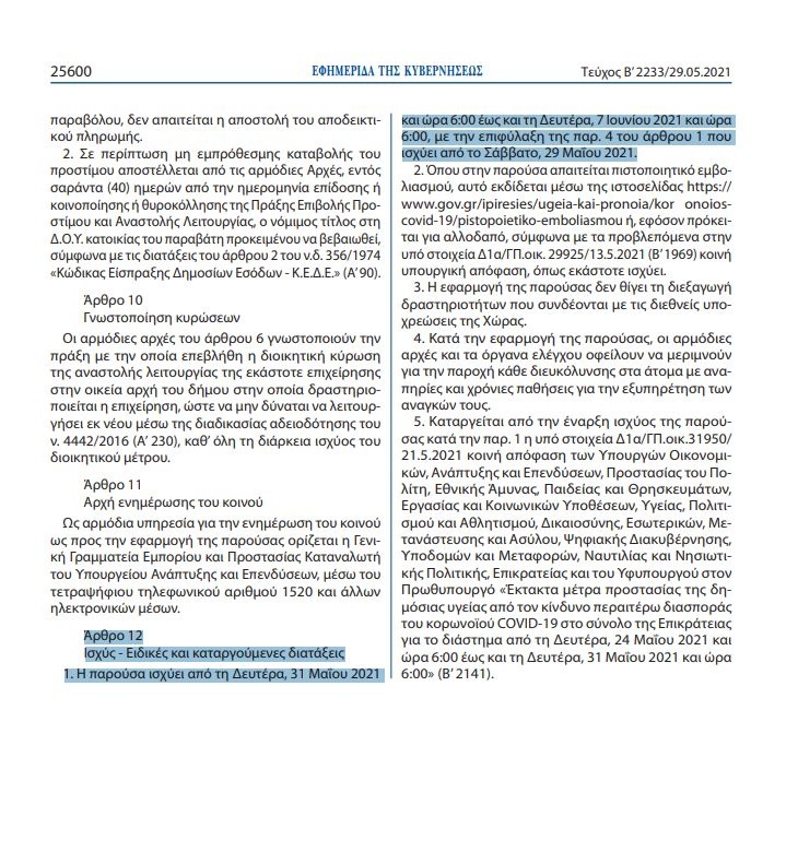 Μάλιστα, είναι ενδεικτικό πως στο ΦΕΚ 2233, στο δεύτερο τεύχος, που δημοσιεύτηκε σήμερα 29 Μαΐου 2021, αναφέρεται ότι τα έκτακτα μέτρα προστασίας που προβλέπονται από την ΚΥΑ αφορούν «το διάστημα από τη Δευτέρα, 31 Μαΐου 2021 και ώρα 6:00 έως και τη Δευτέρα, 7 Ιουνίου 2021 και ώρα 6:00».