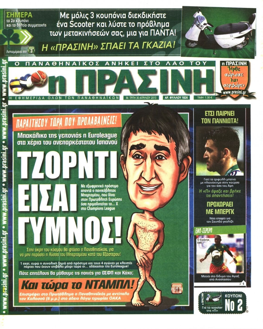 H… απάντηση θα έρθει στο FINAL 4 του Βερολίνου. Ο Παναθηναϊκός αντιμετωπίζει στον τελικό την ΤΣΣΚΑ και τους… διαιτητές του Μπερτομέου! Είναι τόσο ξεδιάντροπη η προσπάθεια να «κλαπεί» η νίκη που ο Θανάσης, αντί να πανηγυρίσει την κούπα, πετάει ένα μάτσο χαρτονομίσματα στα πόδια του Ισπανού, που δεν αντιδρά καν. Η ντροπή, ντροπή δεν έχει.