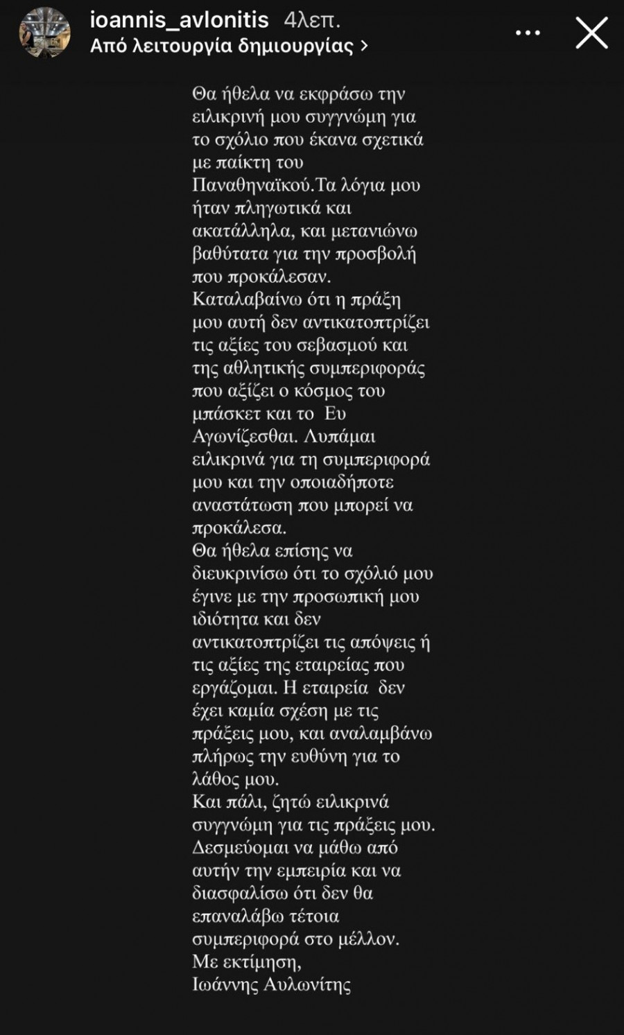 Η ανάρτηση συγγνώμης και η απολογία του Ιωάννη Αυλωνίτη: