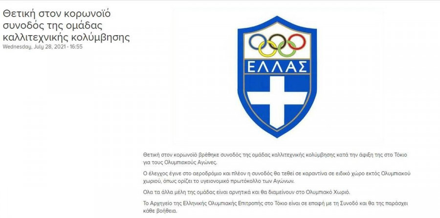 Σήμερα η ΕΟΕ ανακοίνωσε ότι συνοδός της ομάδας καλλιτεχνικής κολύμβησης βρέθηκε θετική στον κορονοϊό κατά την άφιξη της στο Τόκιο για τους Ολυμπιακούς Αγώνες και τέθηκε σε καραντίνα.