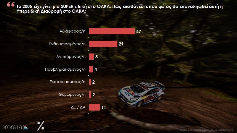 Η Prorata πραγματοποίησε έρευνα για το Ράλλυ Ακρόπολις και την ένταξή του στο διεθνές καλεντάρι. Η πλειοψηφία των ερωτηθέντων απάντησε πως είναι ιδιαίτερα σημαντική αυτή η εξέλιξη για την προβολή της Ελλάδας στο εξωτερικό, ενώ ενδιαφέρον παρουσιάζουν και τα υπόλοιπα χαρακτηριστικά της έρευνας.