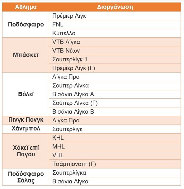 Ο ΟΠΑΠ ενημέρωσε πως οι αγώνες των παρακάτω ρωσικών διοργανώσεων δεν θα διατίθενται προς στοιχηματισμό είτε μέσω του Pamestoixima.gr, είτε μέσω του δικτύου των Καταστημάτων ΟΠΑΠ.