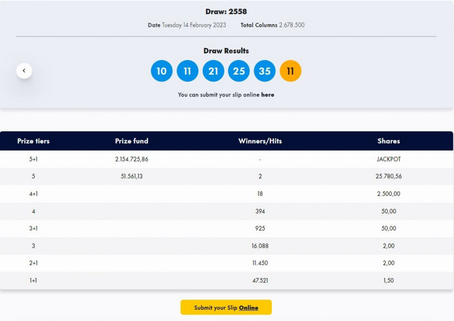 Οι τυχεροί αριθμοί που ανέδειξε η αποψινή κληρωτίδα είναι: 10, 11, 21, 25, 35 και Τζόκερ ο αριθμός 11.