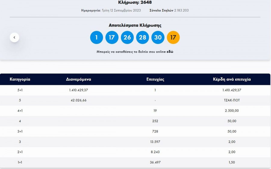 Κλήρωση Τζόκερ σήμερα (12/9): Ένας τυχερός κέρδισε το ποσό των 1.410.000 ευρώ
