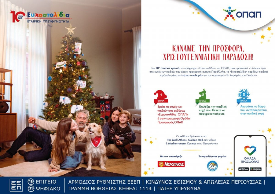 Η προσφορά στα παιδιά που έχουν ανάγκη έχει γίνει χριστουγεννιάτικη παράδοση από τον ΟΠΑΠ, μέσω της πρωτοβουλίας Ευχοστολίδια, η οποία υλοποιείται εφέτος για δέκατη συνεχή χρονιά. Αυτά τα Χριστούγεννα, τα Ευχοστολίδια στηρίζουν χιλιάδες παιδιά από τον Οργανισμό «Το Χαμόγελο του Παιδιού» και ο ΟΠΑΠ μας καλεί να συμμετάσχουμε στην εκπλήρωση των ευχών τους.