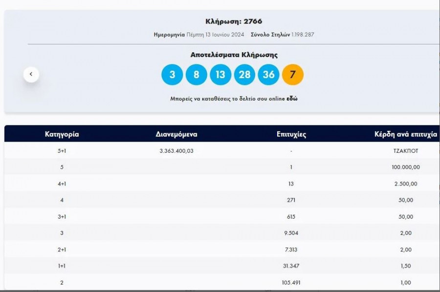Στην κλήρωση Τζόκερ ΟΠΑΠ, σήμερα Πέμπτη 13/06/2024, οι τυχεροί αριθμοί ήταν οι: 3, 8, 13, 28, 36 και Τζόκερ ο αριθμός: 7.