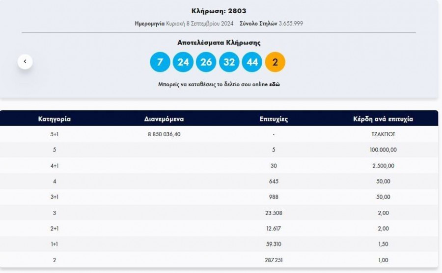44, 32, 24, 7, 26 και Τζόκερ ο αριθμός: 2.