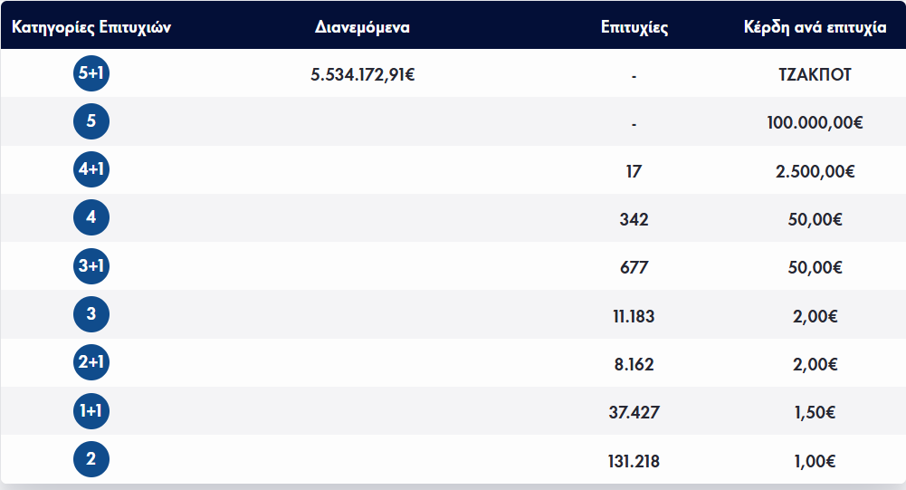 Ως αποτέλεσμα του αποψινού διπλού τζακ ποτ οι τυχεροί της πρώτης κατηγορίας της επόμενης κλήρωσης θα μοιραστούν τουλάχιστον 5.900.000 ευρώ!