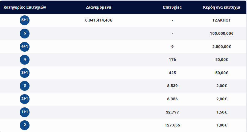 Ως αποτέλεσμα του αποψινού διπλού τζακ ποτ το Τζόκερ θα μοιράσει στους νικητές της πρώτης κατηγορίας της ερχόμενης κλήρωσης τουλάχιστον 6.300.000 ευρώ!