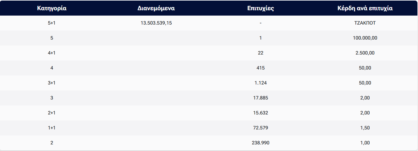 Αξίζει να σημειωθεί ότι από την αποψινή κλήρωση αναδείχθηκε ένα επιτυχημένο δελτίο στην δεύτερη κατηγορία (5αρια) που κερδίζει το ποσό των 100.000 ευρώ.