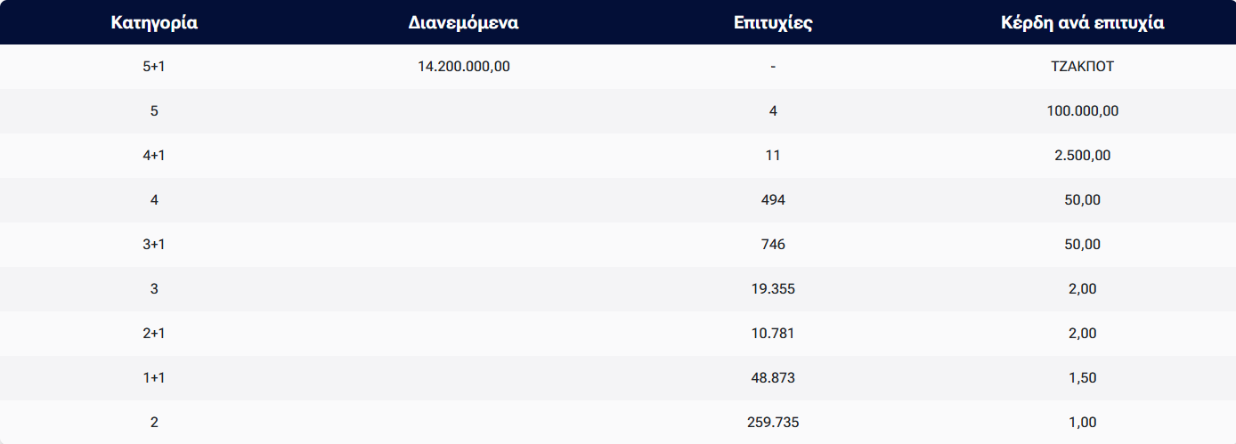 Αξίζει να σημειώθεί ότι από την αποψινή κλήρωση αναδείχθηκαν στην δεύτερη κατηγορία (5αρια) 4 επιτυχημένα δελτία που κερδίζουν από 100.000 ευρώ το κάθε ένα.