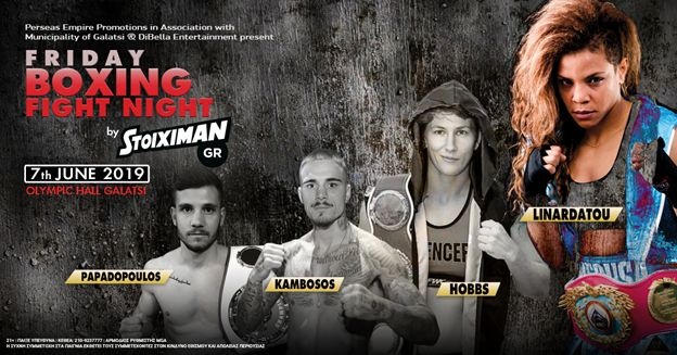 Πλούσιο θέαμα στους καλύτερους αγώνες επαγγελματικής πυγμαχίας που έχουν διοργανωθεί μέχρι σήμερα στην Ελλάδα ετοιμάζονται να προσφέρουν κορυφαίοι Έλληνες και ξένοι μποξέρ στο Ολυμπιακό Κέντρο Γαλατσίου! Ανάμεσα στις κορυφαίες αναμετρήσεις των πυγμαχικών αστέρων, που θα βρεθούν στο «Friday Boxing Fight Night by Stoiximan» στις 7 Ιουνίου, ξεχωρίζει ο αγώνας της Χριστίνας Λιναρδάτου ενάντια στην Αυστραλή Ντίντι Χομπς, όταν και η Ελληνίδα πρωταθλήτρια θα κληθεί να υπερασπιστεί τη ζώνη του Παγκόσμιου Τίτλου της WBO στην κατηγορία Junior Welterweight, κάτι που συμβαίνει για πρώτη φορά στα πυγμαχικά χρονικά επί ελληνικού εδάφους! Στο ρινγκ της σπουδαίας αυτής βραδιάς, όμως, θα ανέβει και ο Ελληνοαυστραλός, Τζώρτζ Καμπόσος τζούνιορ, που είναι ο βασικός sparring παρτενέρ του μοναδικού οκτάκις παγκόσμιου πρωταθλητή στην ιστορία της πυγμαχίας, Manny Pacquiao.