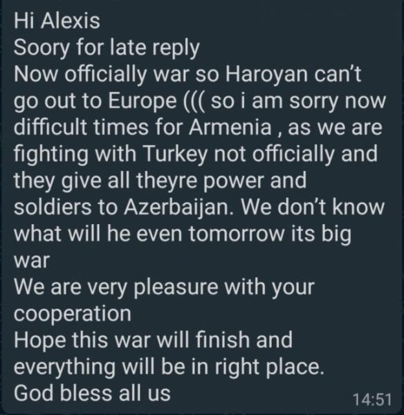 «Πριν από λίγα λεπτά ο μάνατζερ του αρχηγού της εθνικής Αρμενίας Haroyan μας ενημέρωσε ότι η μεταγραφή του παίκτου στην ΑΕΛ ματαιώνεται, τουλάχιστον για αυτή την μεταγραφική περίοδο, γιατί ο ποδοσφαιριστής όπως και όλοι οι Αρμένιοι πολίτες μέχρι 40 ετών επιστρατεύτηκαν και ήδη ευρίσκεται στο πεδίο των μαχών.