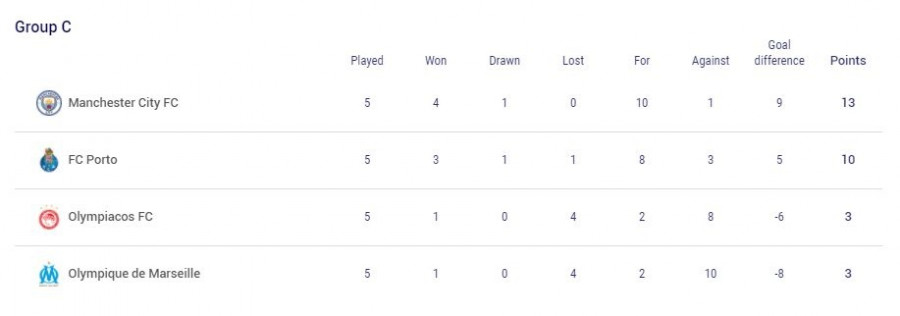 Ο Ολυμπιακός έμεινε στους 3 βαθμούς μετά την ήττα στη Γαλλία, με τη Μάντσεστερ Σίτι να έχει «καθαρίσει» την πρόκριση με 13 βαθμούς και την Πόρτο να την ακολουθεί με 10, μετά τη μεταξύ τους ισοπαλία (0-0) στο «Ντραγκάο».