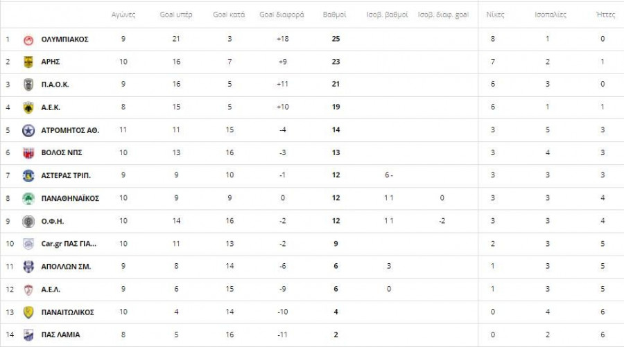Νωρίτερα, ο Άρης πήρε παλικαρίσιο βαθμό στο Περιστέρι, καθώς απέσπασε 2-2 από τον Ατρόμητο. Οι «κίτρινοι» βρέθηκαν να χάνουν 2-0, από πέναλτι του Μανούσου στο 37΄ και γκολ του Μουνίθ στο 51΄, ενώ από στη φάση του πέναλτι αποβλήθηκε ο Ρόουζ.
