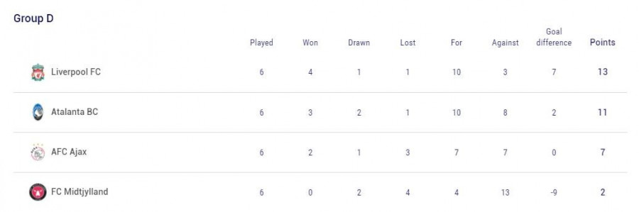 Η Λίβερπουλ δεν κατάφερε να νικήσει την Μίντιλαντ, η οποία απέσπασε 1-1, αλλά αυτό μικρή σημασία έχει. Οι «κόκκινοι» πήραν την πρώτη θέση του ομίλου τους, με την Αταλάντα να είναι δεύτερη, ενώ στο Europa League θα συνεχίσει ο Άγιαξ.