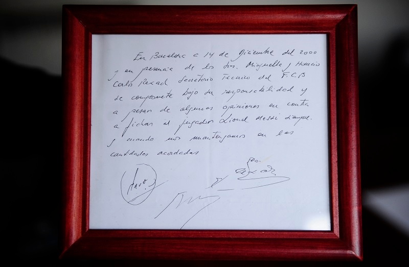 Κι εκεί ο Ρεσάκ έμελλε να κάνει μια κίνηση που θα άλλαζε μια για πάντα την ιστορία του ποδοσφαίρου. Πήρε μια χαρτοπετσέτα κι άρχισε να γράφει: «Στη Βαρκελώνη, στις 14 Δεκεμβρίου του 2000 και παρουσία των κυρίων Μινγκέγια και Γκατσιόλι, ο Κάρλες Ρεσάκ, τεχνικός γραμματέας της Μπαρτσελόνα, δεσμεύεται υπ' ευθύνη του και παρά το γεγονός ότι υπάρχουν κάποιες αντίθετες γνώμες, να προσφέρει συμβόλαιο στον παίκτη Λιονέλ Μέσι, πάντα και εφόσον τηρηθούν τα συμφωνημένα ποσά». Από κάτω μπήκαν οι υπογραφές των Ρεσάκ, Μινγκέγια και Γκατσιόλι.