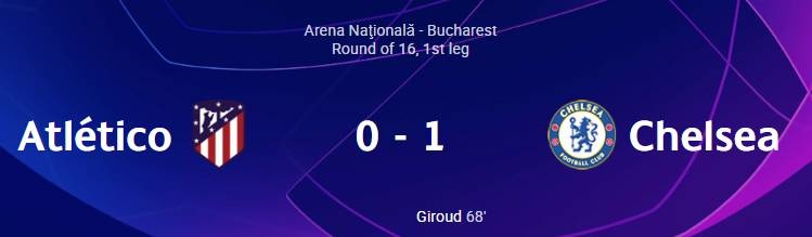 Σημαντικό βήμα για την παρουσία της στους «8» έκανε κι η Τσέλσι, η οποία νίκησε 1-0 την Ατλέτικο Μαδρίτης, σε ματς που έγινε στο Βουκουρέστι. Ο Σιμεόνε παρέταξε την πιο συντηρητική εκδοχή της ομάδας του, αλλά η Τσέλσι είχε υπομονή τελικά πήρε αυτό που ήθελε. Μάλιστα, το έπραξε με ένα πολύ όμορφο γκολ από τον Ολιβιέ Ζιρού, έστω κι αν η φάση χρειάστηκε να εξεταστεί για αρκετή ώρα στο VAR πριν μετρήσει.