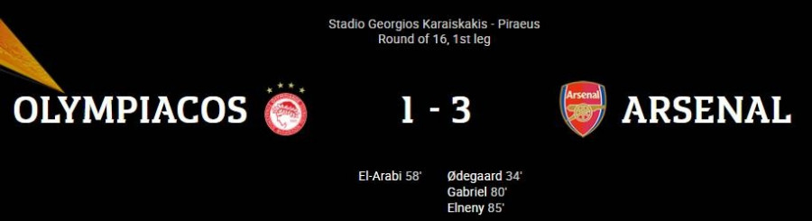 Ολυμπιακός - Άρσεναλ: Οι «ερυθρόλευκοι» γνώρισαν την ήττα (1-3) από την ομάδα του Λονδίνου, η οποία έκανε καθοριστικό βήμα πρόκρισης για τα προημιτελικά του Europa League.