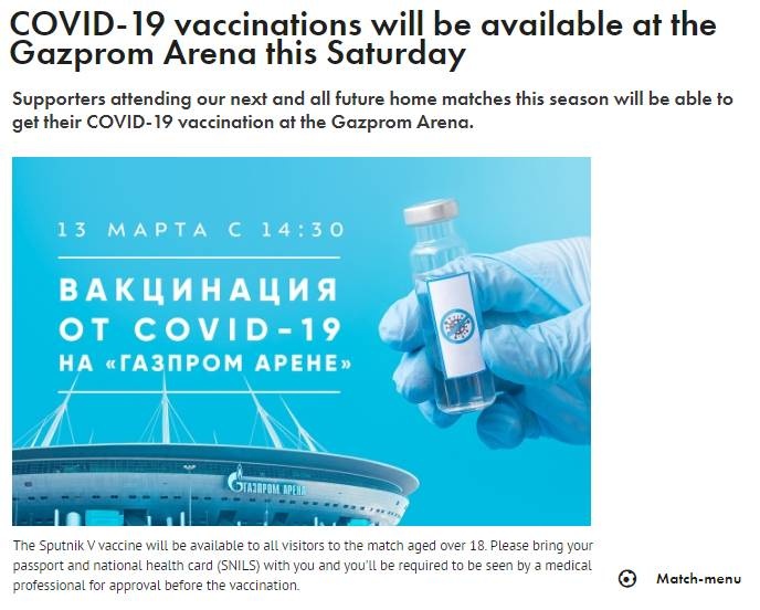 Έξω από την Gazprom Arena θα τοποθετηθεί ένας ειδικός εμβολιαστικός σταθμός που θα υπάρχει σε όλα τα εντός έδρας ματς της Ζενίτ κι όσοι φίλαθλοι άνω των 18 ετών το επιθυμούν θα μπορούν να εμβολιαστούν με το Sputnik V.