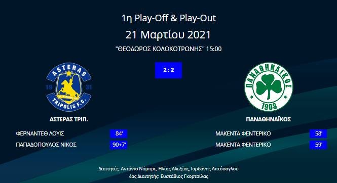 Ο Φεντερίκο Μακέντα με δύο γκολ σε δύο λεπτά (58’-59’) έδωσε μεγάλο προβάδισμα στους «πράσινους», όμως ο Αστέρας κατάφερε με τρομερή αντεπίθεση διαρκείας στο φινάλε να μειώσει στο 84’ με τον Λουίς Φερνάντεθ και να «αρπάξει» το βαθμό στο 90+7’ με το σουτ του Παπαδόπουλου!