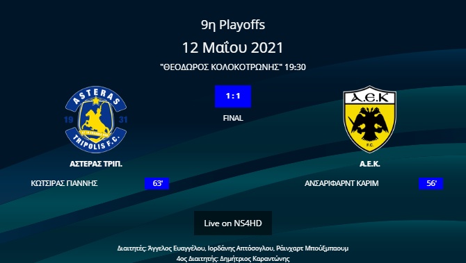 Η ΑΕΚ είχε τον έλεγχο στην Τρίπολη, προηγήθηκε με τον Ανσαριφάρντ, αλλά ο Αστέρας απάντησε και με το τελικό 1-1 διατήρησε το αήττητο στην έδρα του στα playoffs. Οι Αρκάδες δεν έχουν πανηγυρίσει νίκη στο «μίνι» πρωτάθλημα, παρ' όλα αυτά δεν άφησαν και καμία από τις άλλες πέντε ομάδες να περάσουν από την έδρα του. Μετά τον Παναθηναϊκό, τον ΠΑΟΚ, τον Άρη και τον Ολυμπιακό, η ομάδα του Ράσταβατς σταμάτησε και την «Ένωση»!