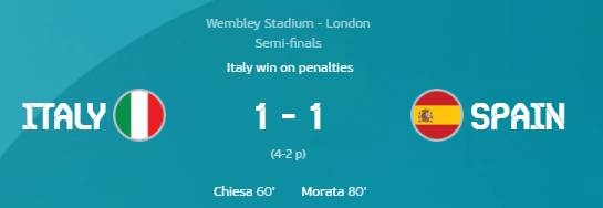 Στη διαδικασία, μολονότι, ο Ουνάι Σιμόν απέκρουσε το πρώτο πέναλτι του Λοκατέλι, ο κορυφαίος του ματς, Ντάνι Όλμο αστόχησε, ενώ στη συνέχεια ο Ντοναρούμα νίκησε τον Μοράτα. Στο καθοριστικό πέναλτι ο Ζορζίνιο με άψογη εκτέλεση έστειλε την Ιταλία στον τελικό της Κυριακής (11/07).