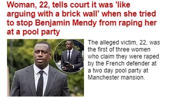 Το φερόμενο θύμα ήταν η πρώτη από τις τρεις γυναίκες που ισχυρίστηκαν ότι βιάστηκαν από τον Γάλλο αμυντικό σε ένα διήμερο πάρτι στην πισίνα της έπαυλής του αξίας 4,8 εκατομμυρίων λιρών μεταξύ 23 και 24 Ιουλίου πέρυσι.