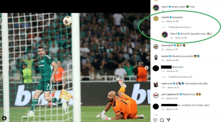 Ο Κροάτης χαφ και ο Έλληνας φορ ήταν εκ των πρωταγωνιστών των ευρωπαϊκών αγώνων των ομάδων τους, σκοράροντας αμφότεροι. Μάλιστα, ο παίκτης της ΑΕΚ έσπευσε να σχολιάσει κάτω από post του Ιωαννίδη στο Instagram. «Υπερπαίκτης», έγραψε και ο άσος του Παναθηναϊκού του απάντησε με τον ίδιο τρόπο.