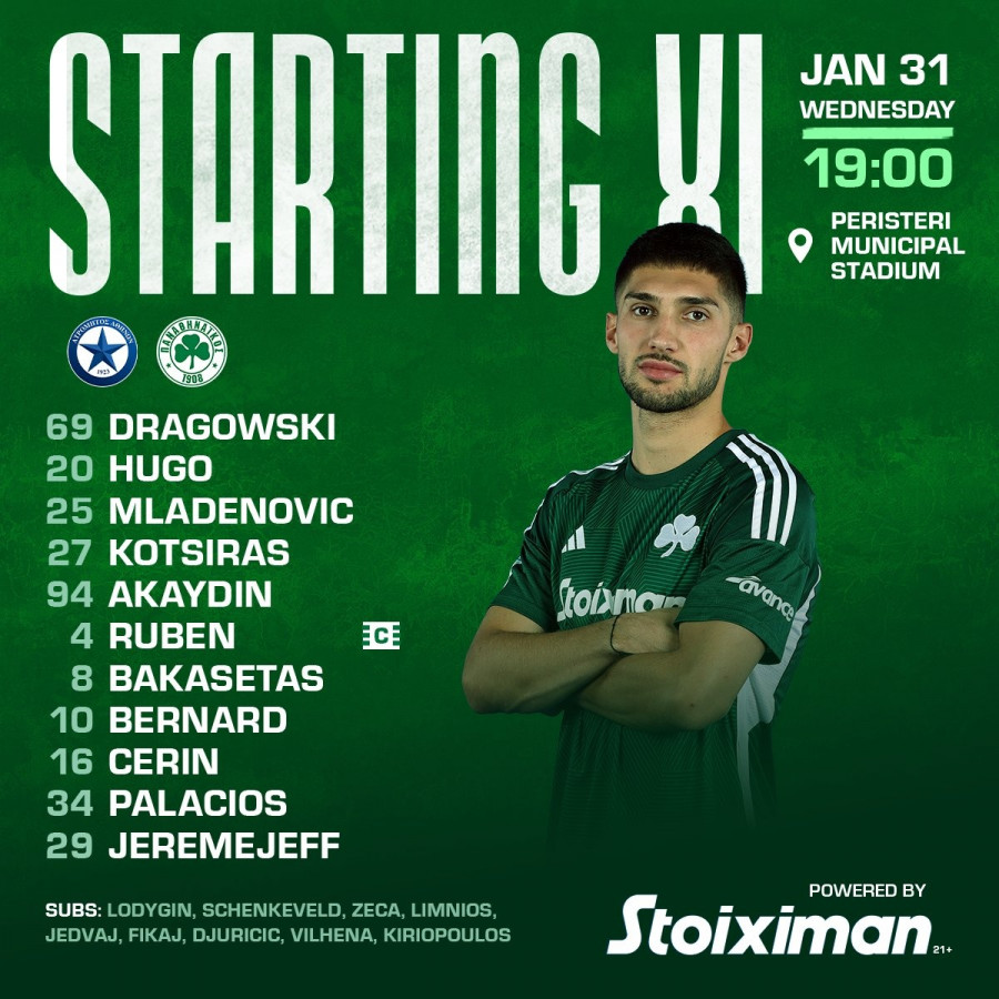 Στον πάγκο για τους «πράσινους» οι: Λοντίγκιν, Σένκεφελντ, Ζέκα, Λημνιός, Γεντβάι, Φικάι, Τζούρισιτς, Βιλένα, Κυριόπουλος.