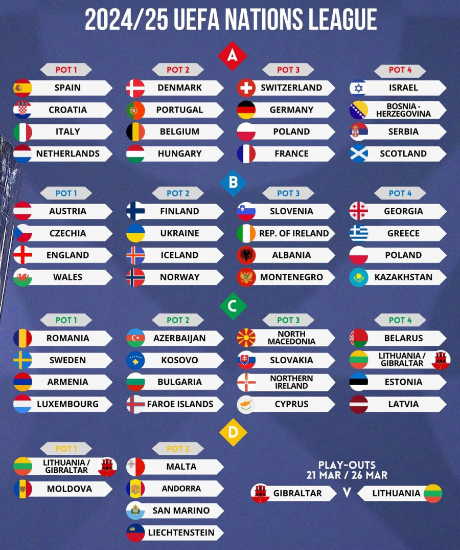 Η κλήρωση για το Nations League της περιόδου 2024-25, θα πραγματοποιηθεί σήμερα. Στις 19:00 στο Παρίσι. Η Ελλάδα βρίσκεται στη League B μετά την πρωτιά και την άνοδό της απ’ την πιο κάτω κατηγορία. Θα βρίσκεται στο pot 4 και δεν μπορεί να κληρωθεί με Εθνική που βρίσκεται επίσης εκεί. Δηλαδή δεν μπορεί να παίξει το αντιπροσωπευτικό μας συγκρότημα με μία εκ των: Γεωργία, Τουρκία ή Καζακστάν.