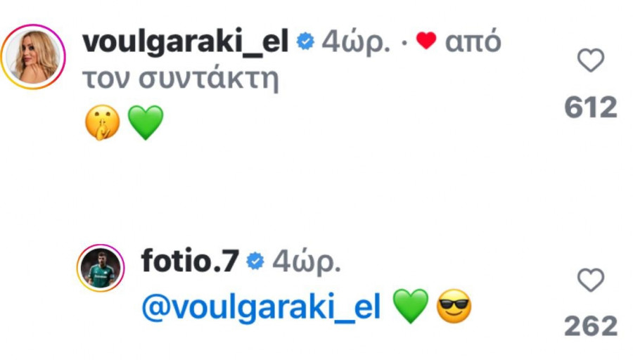 Σχόλιο στη συγκεκριμένη ανάρτηση έκανε και η σύντροφός του, Ελένη Βουλγαράκη. Η γνωστή παρουσιάστρια έβαλε ένα εικονίδιο σα να λέει «μη μιλάτε» και δίπλα μια πράσινη καρδιά. Με τον Ιωαννίδη να της απαντά επίσης με μια πράσινη καρδιά.