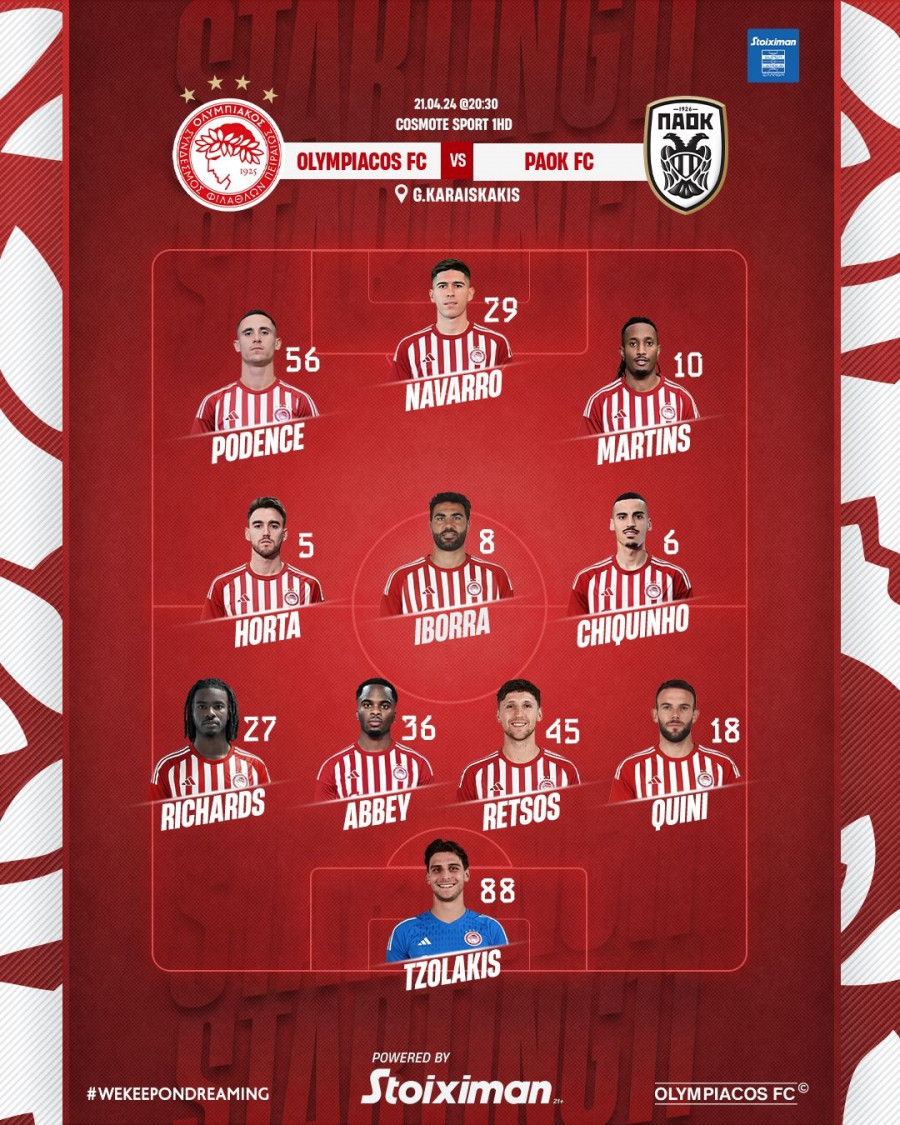 Στην προσπάθεια αυτή, ο Χοσέ Λουίς Μεντιλίμπαρ προχωρά σε rotation με αρκετά νέα πρόσωπα στο βασικό σχήμα. Ο Τζολάκης κάτω απ’ τα δοκάρια, με τους Κίνι και Ρίτσαρντς στα άκρα της άμυνας. Στόπερ θα είναι οι Ρέτσος και Αμπέι.