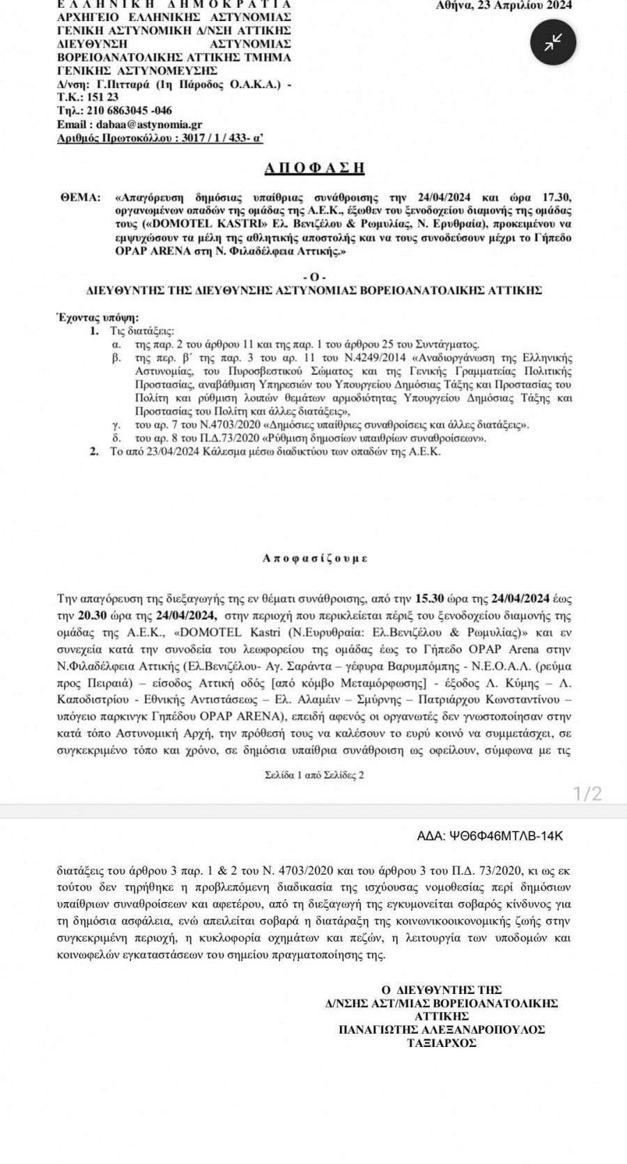 Η Ελληνική Αστυνομία, όμως, εξέδωσε το βράδυ της Τρίτης (23/4) απόφαση να βάλει «στοπ» σε κάτι τέτοιο! Συγκεκριμένα, η Διεύθυνση Αστυνομίας της Βορειοανατολικής Αττικής απαγορεύει τη συνάθροιση στο συγκεκριμένο σημείο από τις 15:30 έως και τις 20:30.