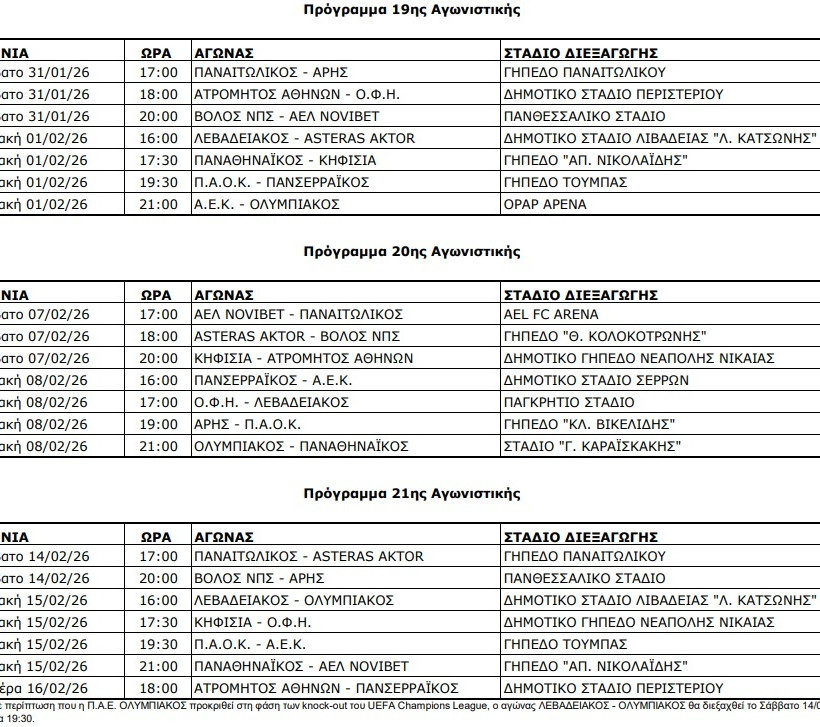 Η Super League ανακοίνωσε κι επίσημα την Δευτέρα (8/12) το πρόγραμμα των αγωνιστικών από την 16η έως την 26η αγωνιστική του πρωταθλήματος, των αγώνων δηλαδή που θα γίνουν μετά τις διακοπές των γιορτών, μέχρι το τέλος της κανονικής περιόδου.