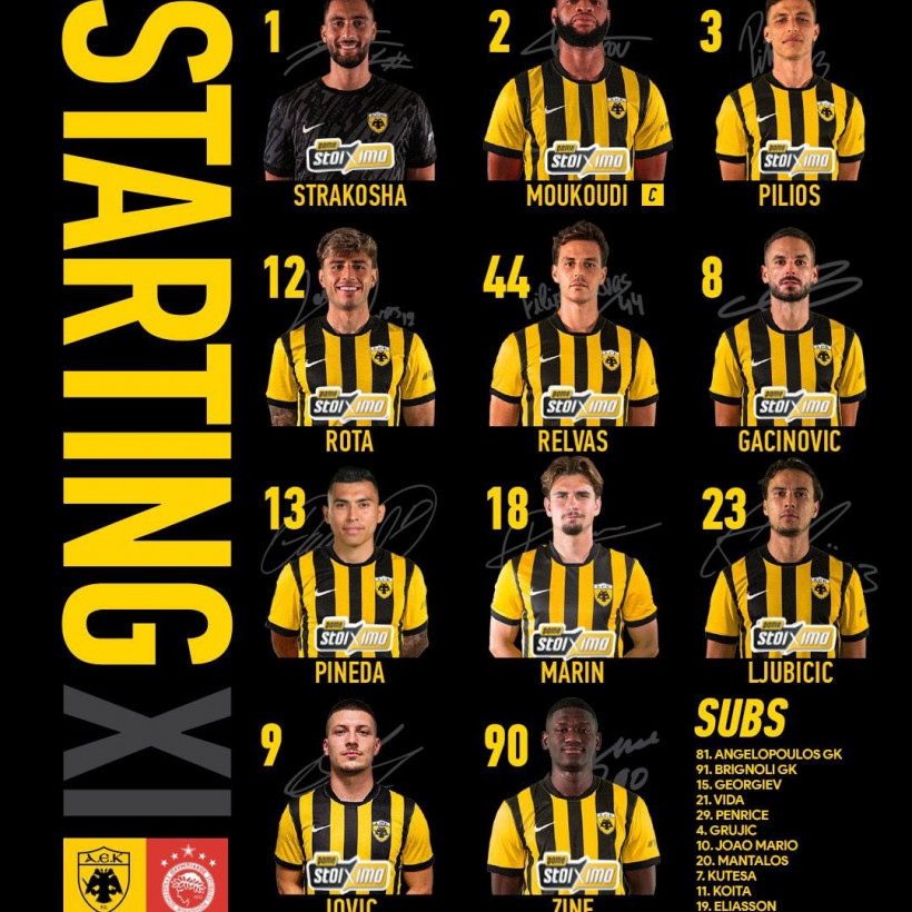 Η ενδεκάδα της ΑΕΚ: Στρακόσα, Ρότα, Μουκουντί, Ρέλβας, Πήλιος, Μαρίν, Πινέδα, Λιούμπιτσιτς, Γκατσίνοβιτς, Ζίνι, Γιόβιτς, ενώ στον πάγκο θα είναι οι: Aγγελόπουλος, Μπρινιόλι, Γκεοργκίεφ, Βίντα, Πενράις, Γκρούγιτς, Ζοάο Μάριο, Μάνταλος, Κουτέσα, Κοϊτά, Ελίασον, Βάργκα.