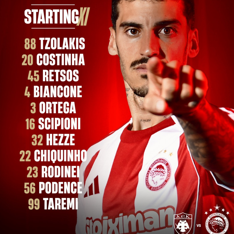H ενδεκάδα του Ολυμπιακού: Τζολάκης, Κοστίνια, Ρέτσος, Μπιανκόν, Ορτέγκα, Σιπιόνι, Έσε, Τσικίνιο, Ροντινέι, Ποντένσε, Ταρέμι, ενώ στον πάγκο είναι οι: Πασχαλάκης, Μπότης, Καλογερόπουλος, Νασιμέντο, Γκαρθία, Μουζακίτης, Γιαζίτσι, Μπρούνο, Λουίζ, Βέζο, Μάρτινς.