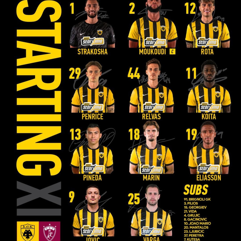 Η ενδεκάδα της ΑΕΚ: Στρακόσα, Ρότα, Μουκουντί, Ρέλβας, Πενράις, Πινέδα, Μαρίν, Κοϊτά, Ελίασον, Βάργκα, Γιόβιτς, ενώ στον πάγκο είναι οι: Μπρινιόλι, Πήλιος, Γκεοργκίεβ, Βίντα, Γκρούγιτς, Γκατσίνοβιτς, Ζοάο Μάριο, Μάνταλος, Λιούμπιτσιτς, Περέιρα, Κουτέσα, Ζίνι.