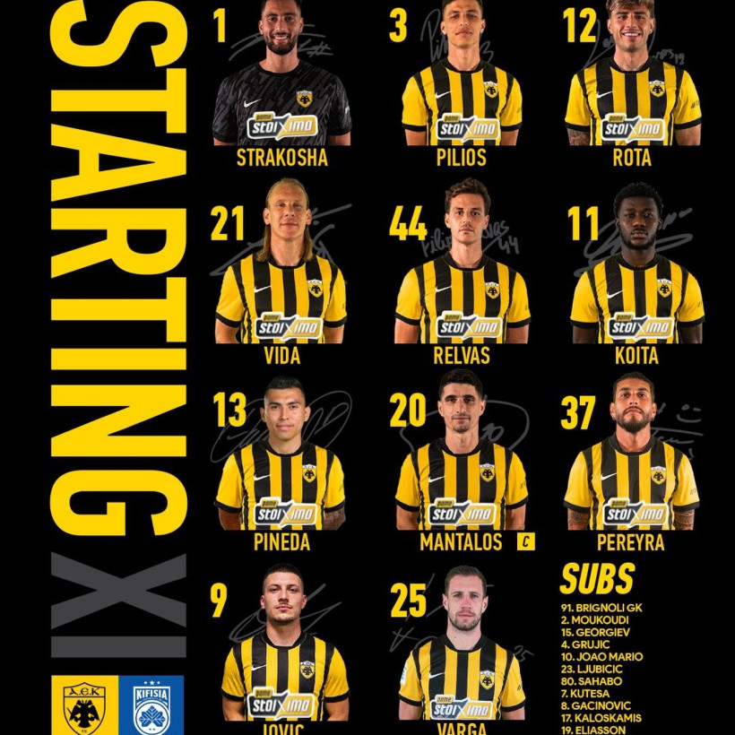 Η ενδεκάδα της ΑΕΚ: Στρακόσα, Ρότα, Βίντα, Ρέλβας, Πήλιος, Πινέδα, Περέιρα, Μάνταλος, Κοϊτά, Γιόβιτς, Βάργκα, ενώ στον πάγκο θα είναι οι: Μπρινιόλι, Μουκουντί, Γκεοργκίεβ, Σαχαμπό, Γκρούγιτς, Καλοσκάμης, Γκατσίνοβιτς, Ζοάο Μάριο, Λιούμπιτσιτς, Ελίασον, Κουτέσα, Ζίνι.