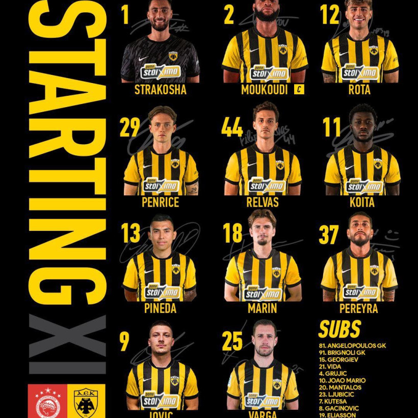 H ενδεκάδα της ΑΕΚ: Στρακόσα, Ρότα, Μουκουντί, Ρέλβας, Πενράις, Μαρίν, Πινέδα, Περέιρα, Κοϊτά, Βάργκα, Γιόβιτς.