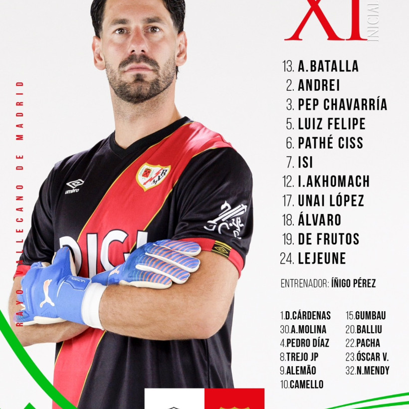 Η ενδεκάδα της Ράγιο Βαγιεκάνο: Μπατάγια, Φελίπε, Λεζέν, Τσαβαρία, Ράτσιου, Σις, Λόπεθ, Παλαθόν, Γκαρθία, Ακχομάχ, Ντε Φρούτος, ενώ στον πάγκο είναι οι: Καρντένας, Μολίνα, Ντίαθ, Τρέχο, Αλεμάο, Καμέγιο, Γκουμπάου, Μπάλιου, Εσπίνο, Βαλεντίν, Μεντί.