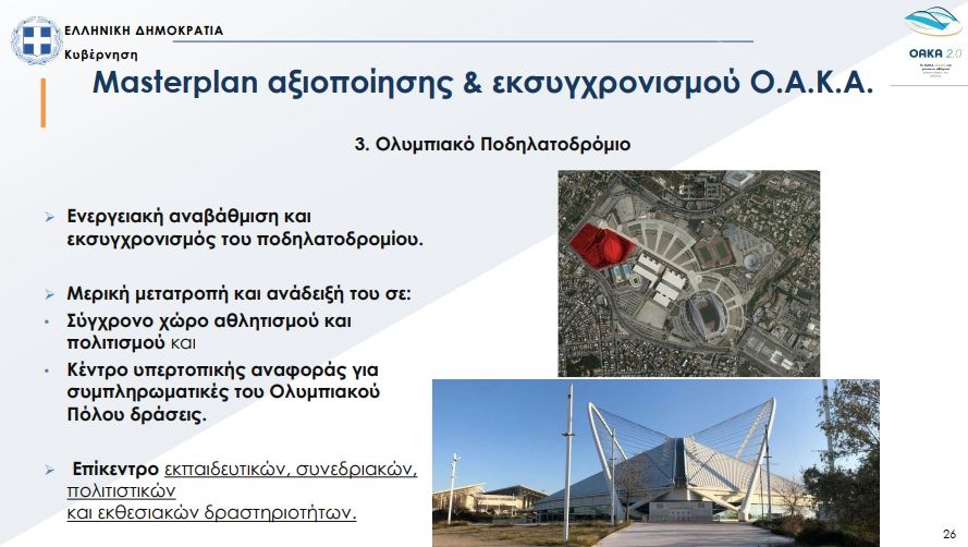 Το Master Plan που παρουσιάστηκε για την αναβάθμιση της μεγαλύτερης αθλητικής εγκατάστασης της χώρας, στοχεύει στην ανάδειξη του ΟΑΚΑ ως υπερτοπικού πόλου με εθνική και διεθνή εμβέλεια, μέσα από την εξασφάλιση 43.500.000€ από το πρόγραμμα της Πράσινης Ανάπτυξης του Ταμείου Ανάκαμψης και Ανθεκτικότητας «Ελλάδα 2.0», αλλά και ιδιωτικών επενδύσεων.