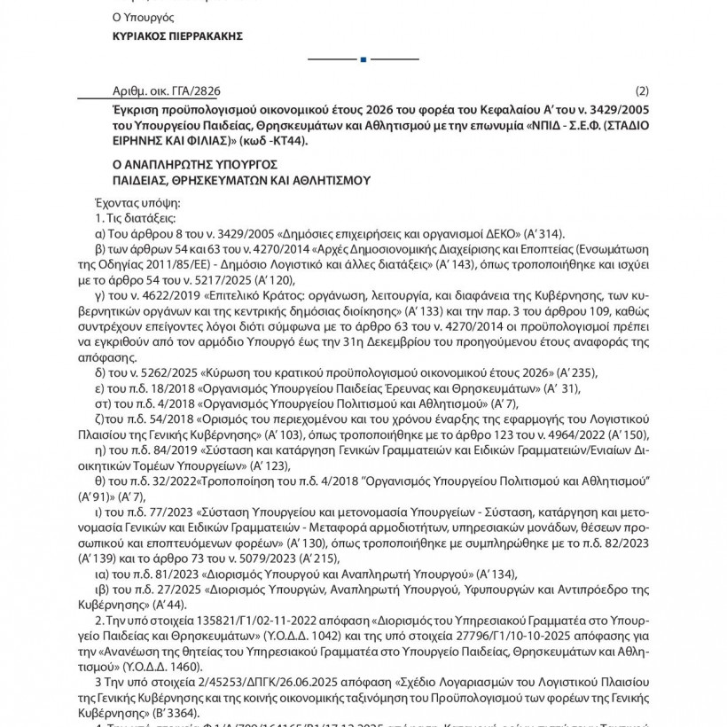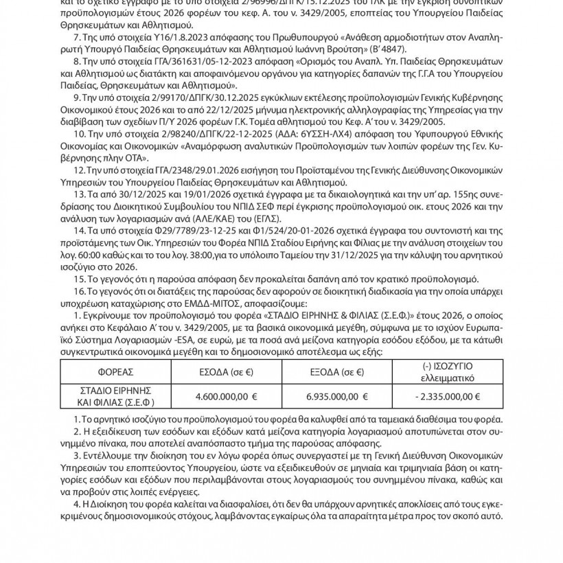 Σύμφωνα με τον προϋπολογισμό του Νομικού Προσώπου Ιδιωτικού Δικαίου «Στάδιο Ειρήνης και Φιλίας» για το 2026: