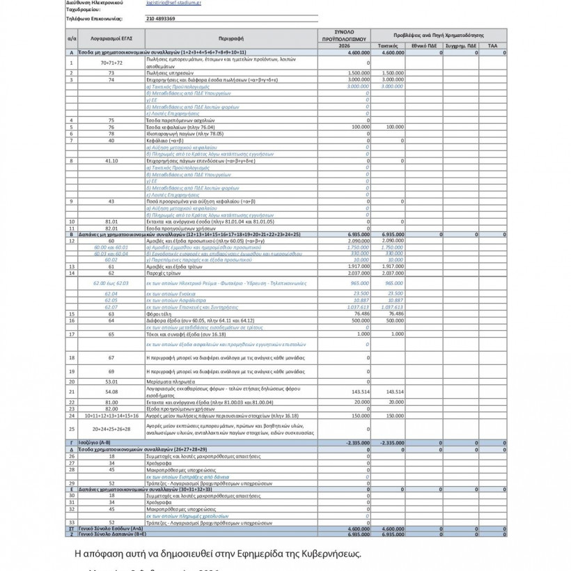 Δείτε το ΦΕΚ στο οποίο δημοσιεύεται ο προϋπολογισμός του ΣΕΦ για το 2026, όπου προβλέπεται ρητώς ότι το Δημόσιο θα καλύψει τον ελλειμματικό προϋπολογισμό.