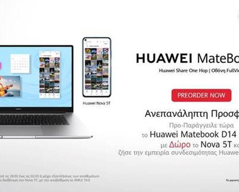 Η λειτουργία Huawei Share One Hop σημαίνει ευκολία: Με ένα άγγιγμα, smartphone και laptop συνδέονται και επικοινωνούν, σε μία οθόνη, προσφέροντας μια ολιστική εμπειρία συνδεσιμότητας: ο χρήστης μπορεί να περνά αρχεία από τη μία συσκευή στην άλλη, να βλέπει τα περιεχόμενα που έχει αποθηκευμένα στο κινητό του απευθείας στον υπολογιστή του, ή να χρησιμοποιεί το πληκτρολόγιο, το ποντίκι και άλλες περιφερειακές συσκευές για να χειρίζεται το smartphone του. Oι δύο συσκευές συνεργάζονται άψογα μεταξύ τους, διευκολύνουν το multi-tasking και δημιουργούν ένα νέο περιβάλλον εργασίας και διάδρασης τόσο εύχρηστο, γρήγορο, αποτελεσματικό και πρακτικό που δεν θα μπορείτε να φανταστείτε με τίποτα να επιστρέφετε σε μια καθημερινότητα χωρίς τη δυνατότητα της λειτουργίας Huawei Share! Μια νέα εποχή ευκολίας και πρακτικότητας ξεκινά για τους χρήστες φορητών υπολογιστών! Ανακαλύψτε τις επαναστατικές «έξυπνες» λειτουργικές δυνατότητες των ολοκαίνουργιων laptops της Huawei, κάνοντας τώρα προπαραγγελία, και κάντε δικό σας εντελώς δωρεάν και το εκπληκτικό πεντακάμερο smartphone της Huawei, Nova 5T.