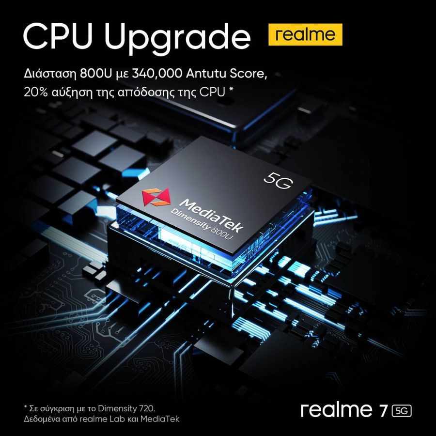 Ο επεξεργαστής MediaTek Dimensity 800U, που τροφοδοτεί το realme 7 5G, κατασκευάζεται με την αξιοποίηση του μικροτσίπ 7nm, κάνοντας έτσι το 7 5G μία εξαιρετικά ισχυρή και αποδοτική συσκευή. Το μοντέλο είναι επίσης εξοπλισμένο με δύο πυρήνες Cortex-A76 υψηλής απόδοσης στα 2,4GHz και έξι πυρήνες Cortex-A55 υψηλής απόδοσης στα 2GHz, σε συνδυασμό με μία κάρτα γραφικών GPU Mali-G57. Ο επεξεργαστής Dimensity 800U προσφέρει άριστη σύνδεση δικτύου ενώ το μοντέλο υποστηρίζει επίσης κάρτα Dual SIM 5G, το οποίο σημαίνει ότι μπορείτε να συνδεθείτε στο δίκτυο 5G και από την κάρτα SIM σας για μια εμπειρία υψηλής ταχύτητας στο Διαδίκτυο με σταθερότητα στη σύνδεση.
