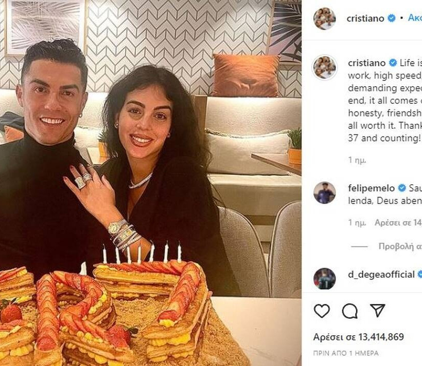 H τελευταία ανάρτηση του Κριστιάνο Ρονάλντο ήταν για τα γενέθλιά του καθώς την Κυριακή έκλεισε τα 37 με την σύζυγό του να ετοιμάζει μια εντυπωσιακή τούρτα και τον ίδιο να γράφει στη λεζάντα της σχετικής φωτογραφίας «η ζωή είναι σαν τρενάκι. Σκληρή δουλειά, υψηλές ταχύτητες, στόχοι και απαιτήσεις. Αλλά στο τέλος όλα αφορούν την οικογένεια, την ειλικρίνεια, τη φιλία και τις αξίες. Σας ευχαριστώ για όλα τα μηνύματα».