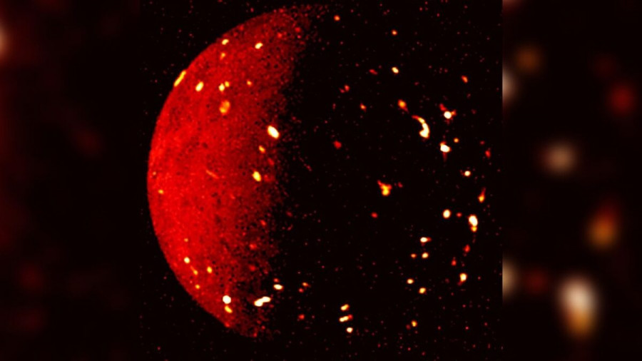 Ο Juno απαθανάτισε μια λαμπερή υπέρυθρη εικόνα του φεγγαριού στις 5 Ιουλίου από 50.000 μίλια (80.000 χιλιόμετρα) μακριά. Τα φωτεινότερα σημεία σε αυτήν την εικόνα αντιστοιχούν με τις πιο καυτές θερμοκρασίες στο φεγγάρι που φιλοξενεί εκατοντάδες ηφαίστεια, μερικά από τα οποία μπορούν να εκτοξεύσουν λάβα ύψους δεκάδων μιλίων.