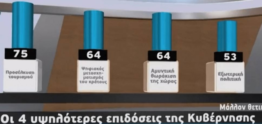Τουρισμός, ψηφιακή μεταρρύθμιση, αμυντική θωράκιση και εξωτερική πολιτική αποτελούν τις τέσσερις πιο επιτυχημένες πολιτικές της κυβέρνησης, όπως καταδεικνύει δημοσκόπηση που πραγματοποίησε η Metron Analysis για λογαριασμό του τηλεοπτικού σταθμού Mega. Οι πολίτες επιβεβαιώνουν το φετινό success story του ελληνικού τουρισμού το οποίο ήδη αποτυπώνεται στα στοιχεία της Τράπεζας της Ελλάδος και της ΕΛΣΤΑΤ.