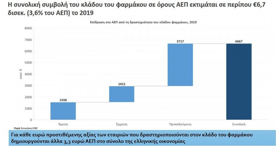 Το ΙΟΒΕ προχώρησε επίσης σε μια νέα εκτίμηση του οικονομικού αποτυπώματος του κλάδου του φαρμάκου στην ελληνική οικονομία. Σύμφωνα με τις πιο πρόσφατες εκτιμήσεις του, η συνολική συνεισφορά του κλάδου του φαρμάκου σε όρους ΑΕΠ εκτιμάται σε 6,7 δισεκ. ευρώ (3,6% του ΑΕΠ) το 2019. Έτσι, για κάθε 1 ευρώ προστιθέμενης αξίας των εταιρειών που δραστηριοποιούνται στον κλάδο του φαρμάκου, δημιουργούνται άλλα 3,3 ευρώ στο σύνολο της ελληνικής οικονομίας. Σε όρους απασχόλησης, η συνολική συνεισφορά εκτιμάται σε 153 χιλιάδες θέσεις εργασίας (ή 3,9% της συνολικής απασχόλησης). Δηλαδή, κάθε θέση εργασίας στον κλάδο του φαρμάκου υποστηρίζει άλλες 3 ισοδύναμες θέσεις πλήρους απασχόλησης συνολικά στην οικονομία. Τέλος, η επίδραση στα φορολογικά έσοδα από τη δραστηριότητα του κλάδου φαρμάκου εκτιμάται περίπου στα 2,0 δισεκ. ευρώ.